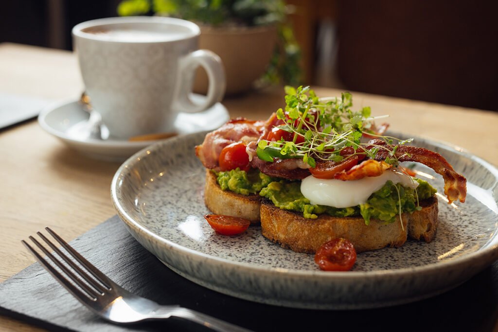Join us for a freshly prepared breakfast feautring options from a Hearty full english to lighter options like out avocado & eggs on Sourdough toast which is pictured here.